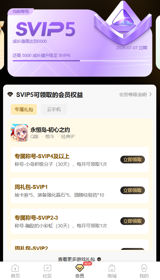 进入“39游戏盒子”-“会员”页面SVIP等级下方找到“永恒岛-初心之约”领取专属权益。