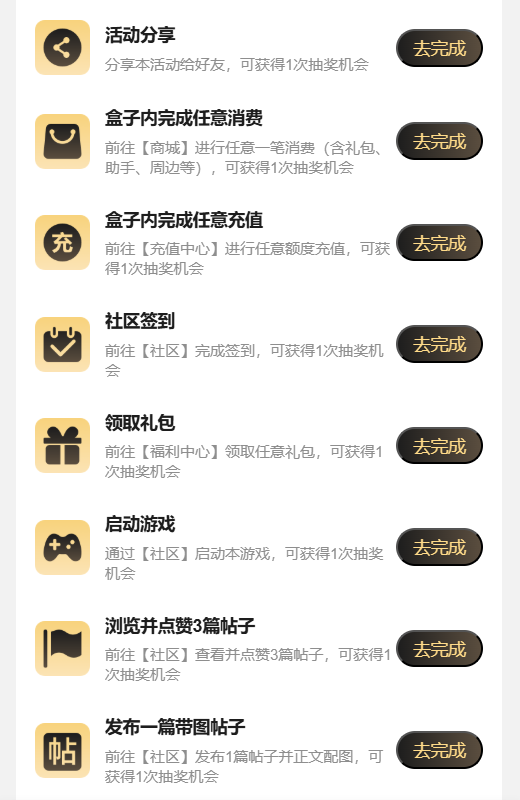 *注意:任务将在每日0点刷新;当日活动的抽奖次数将于次日0点清空,请及时使用,以免造成不必要的损失。